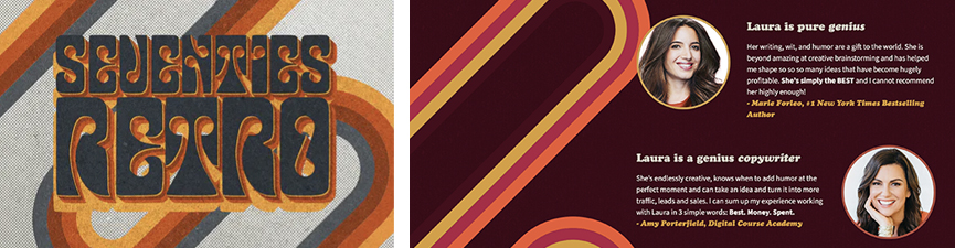When I designed Laura Belgray’s site talkingshrimp.com we knew we wanted a late 70s vibe. So I started searching “70s” for inspiration. Up popped a 70s text effect series of graphic illustrations. I was able to recolor the graphics and use them as the base template for the custom design – again, removing all the stuff I didn’t want to use and using just the elements that looked interesting. You don’t have to use the whole file – just use the parts that interest you! That’s the best aspect of these tools – they can inspire totally new designs because they give you something to start with.